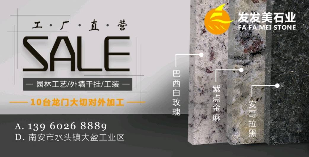南安发发美石雕工艺品有限公司位于324国道边大盈工业区,生产各种进口花岗岩,公司拥有10台龙门切,全自动磨机,5台红外线,承接各种出口花岗岩成品板,条板,欢迎洽谈。