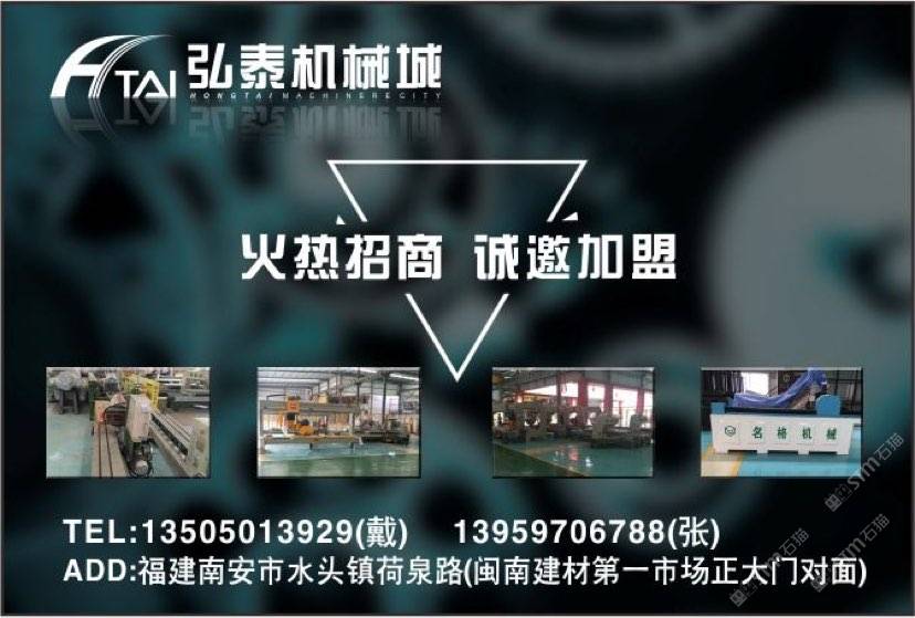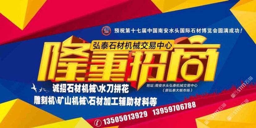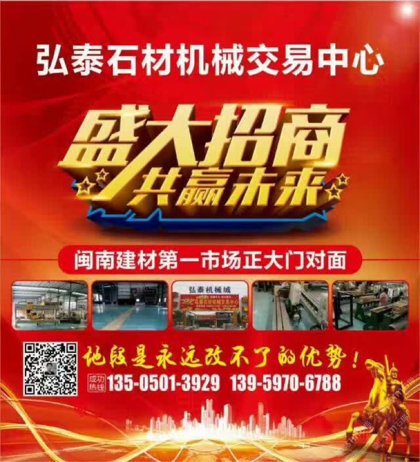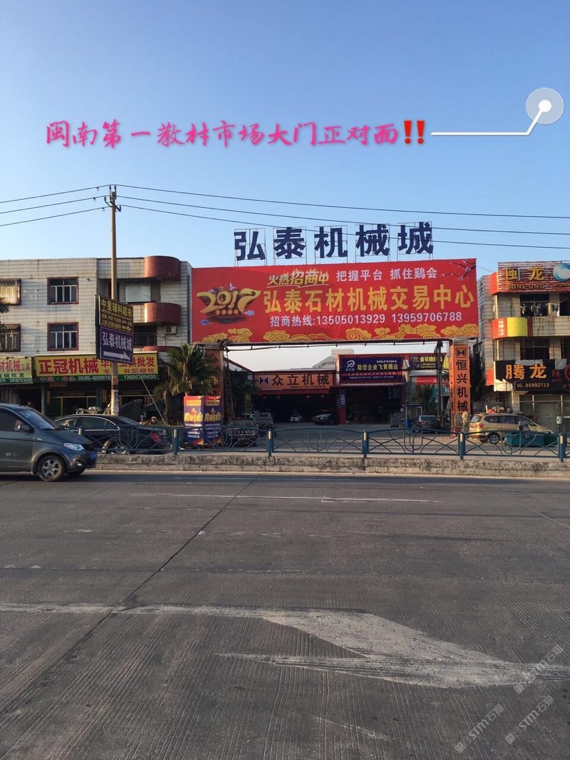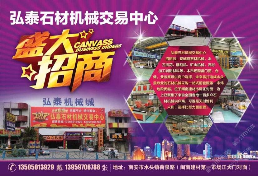弘泰石材机械交易中心招租啦!现诚招石材机械、水刀拼花、雕刻机、矿山机械、石材加工辅助材料等。本市场配备门面,仓储,业务室可供商户选择,未来将打造成水头专业的石材机械采购一站式配套服务,市场地段优越,位于闽南建材市场正对面,边上已聚集了来自全国各地一百多户石材机械供户商,可说是天时地利人和,选择比努力更重要。