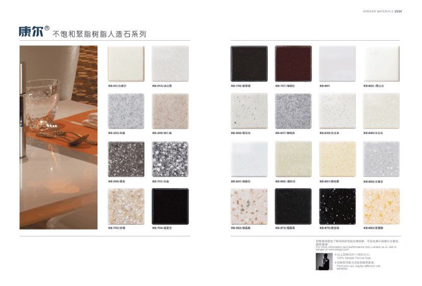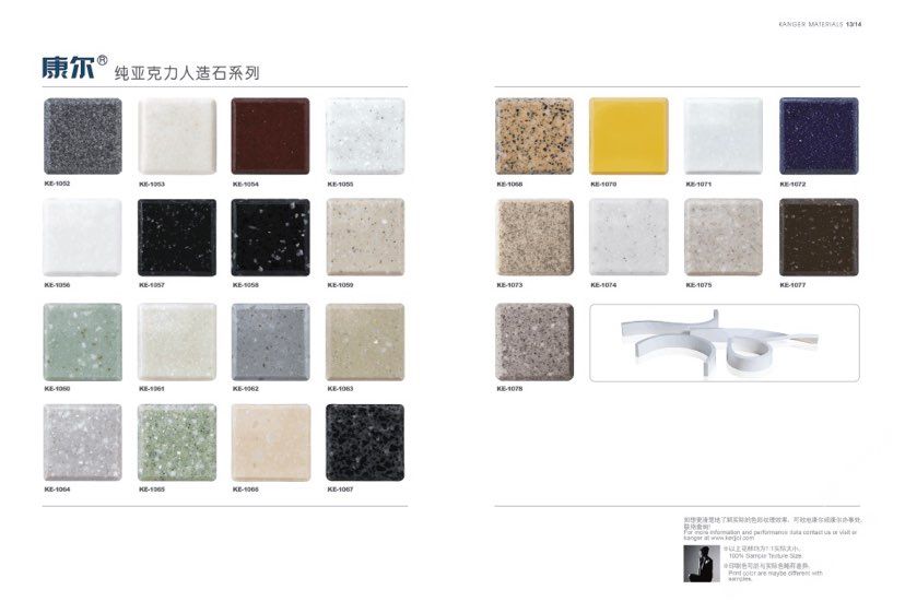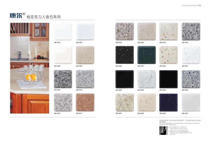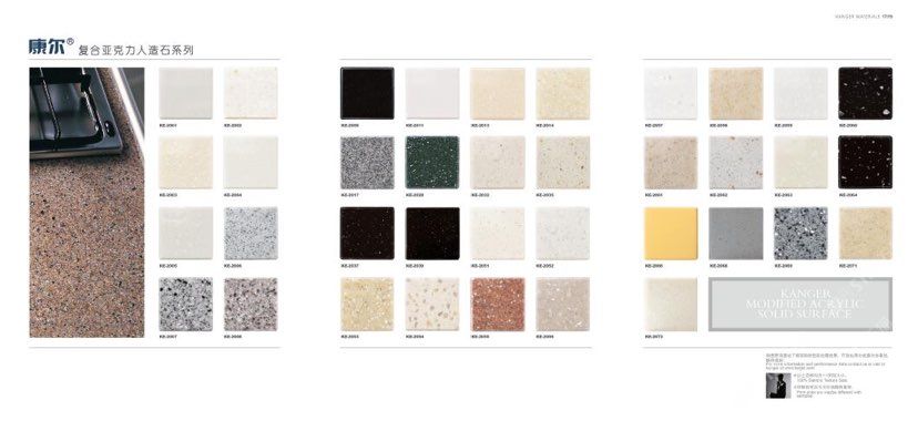 康尔人先后开发出了色彩丰富的 100% 纯亚克力系列,复合亚克力系列,不饱和树脂系列,石英石、集成成品台面和高分子复合材料门板系列。产品系列多样、颜色丰富、品质稳定、已销往世界几十个国家,深受国内外客户的好评.