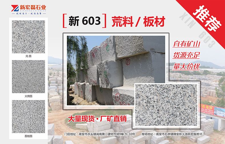 新宏磊石业有限公司自有矿山,荒料堆场50余亩,有花岗岩和大理石加工厂,是集矿山开采、板材生产加工、销售出口为一体的综合性石材供应商,在石材行业已经拥有10年以上的生产与销售经验。