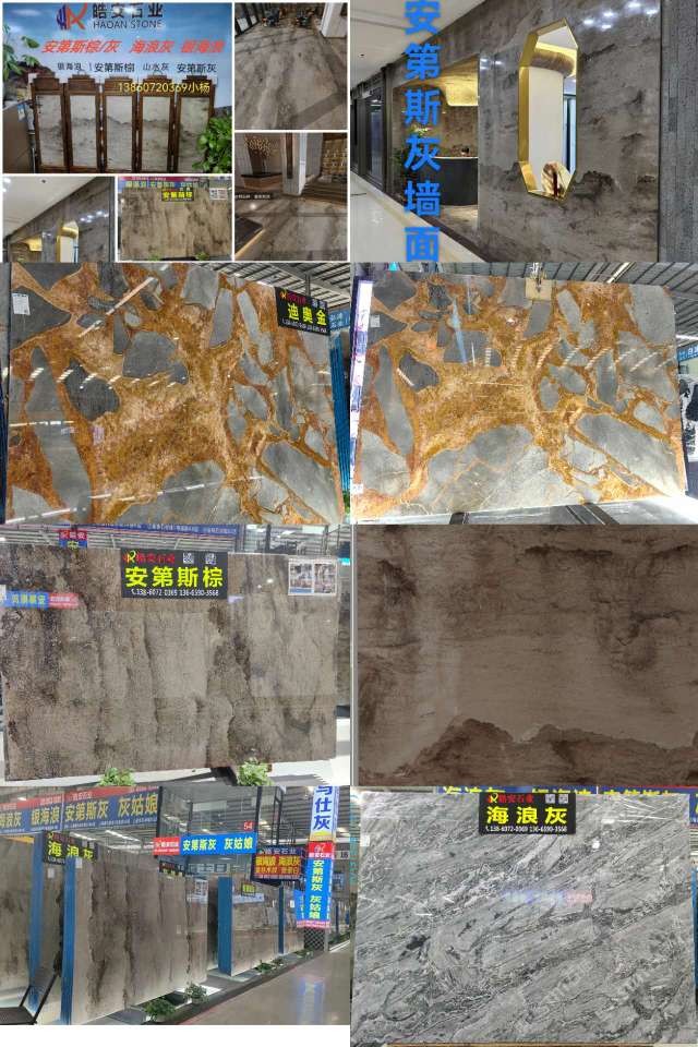皓安石业:主营(一):→安第斯棕~山水灰~水墨棕,其纹路是安第斯山脉连绵不断,雄伟壮观,大自然的鬼斧神工之水墨画般层次分明,若隐若现似山似水又似景的灰色天然大理石…主营(2):海浪灰→银海浪,波涛灰~其纹理变化莫测,犹如海纳百川,呼啸而来,卷起千重浪,气势恢宏!自然写意,不拘章法,大气而灵动适用于各种高档场所的异型拼花、电视背景墙、各种吧台等…是工装家装理想的装饰材料…