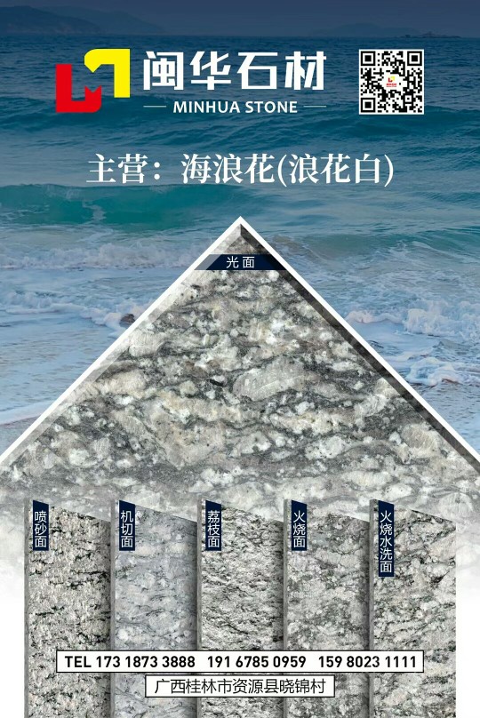 广西资源闽华石材有限公司主营:浪花白(海浪花),常规1.8、2.5、3公分 火烧面 喷砂面 ,光板,各种异性石加工。