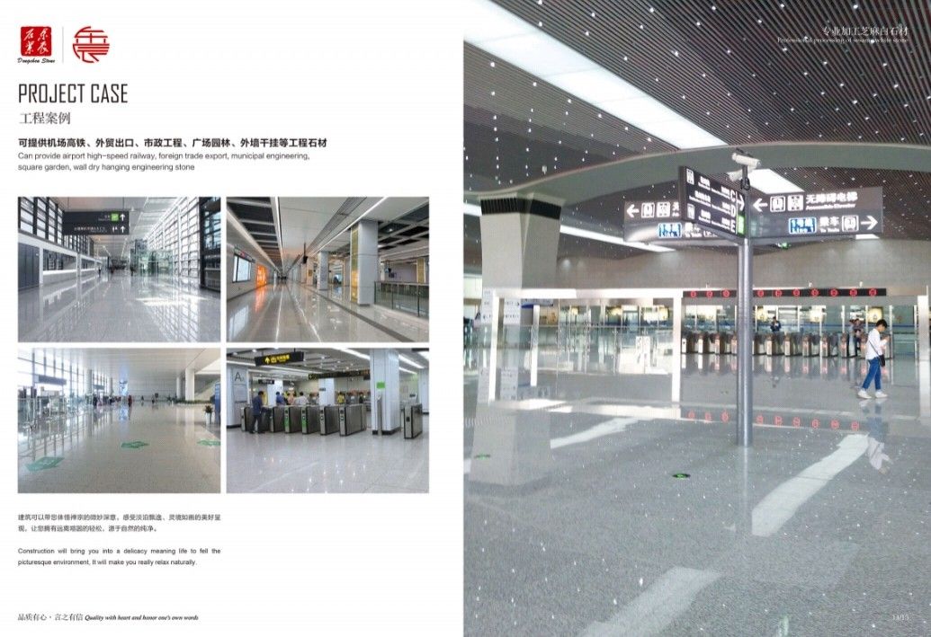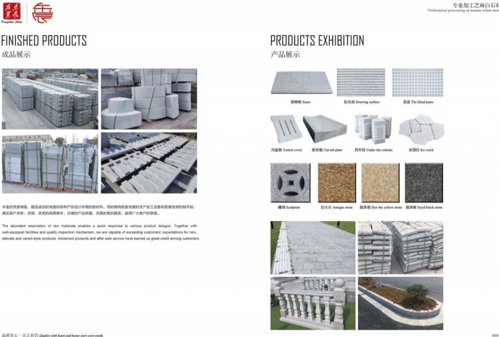 主营:承接高铁机场、外墙干挂、广场别墅、市政工程和外贸出口等各种工程板。 主营芝麻白G603、芙蓉白G602火烧面、光面、荔枝面、斧剁面、喷砂面、拉丝面、菠萝面,水沟盖板、雕刻板、路沿石、蘑菇石、挡车石、马蹄石、冰裂纹、圆球、染色板等