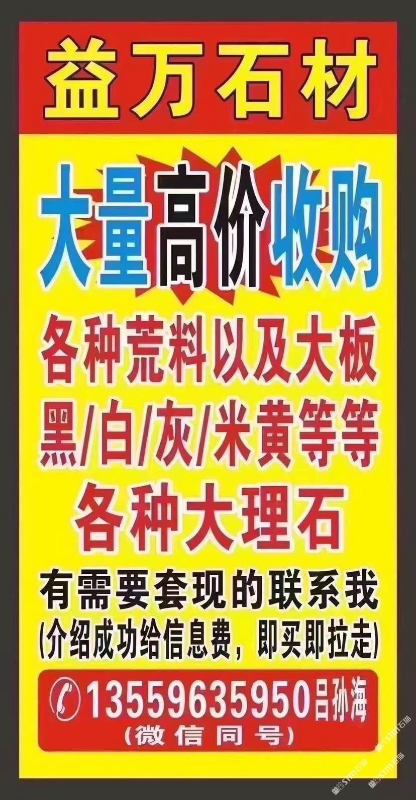 `【长期大量??高价求购】大板,荒料,多少量都可以;云多拉灰,奥特曼,白玉兰,南斯拉夫白,温德姆灰,星耀灰,保加利亚灰,奢石等各种大理石;需要:套现、清仓、换品种的速来,介绍成功给信息费,现收现拉!微信:13559635950吕孙海微信同号