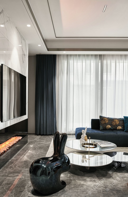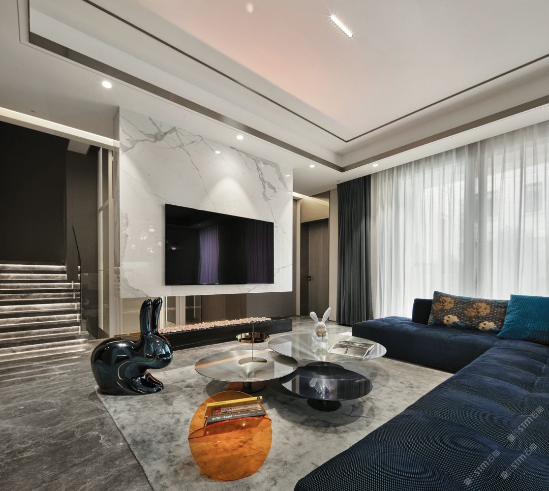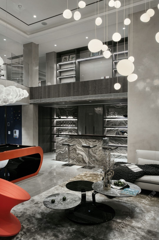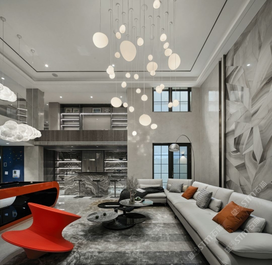 爱马仕灰地面,楼梯,水云莎水吧台及背景,意大利岩板搭配墙面背景。