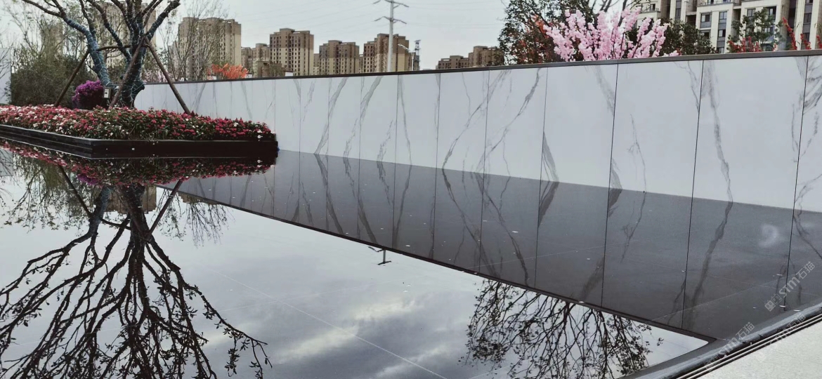 仿石砖:地铺采用经典搭配芝麻黑?灰?白,幕墙采用卡拉拉白。