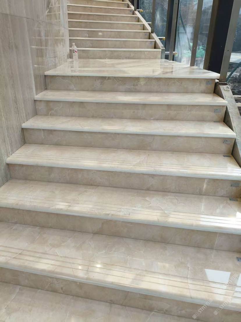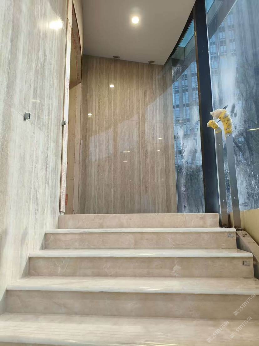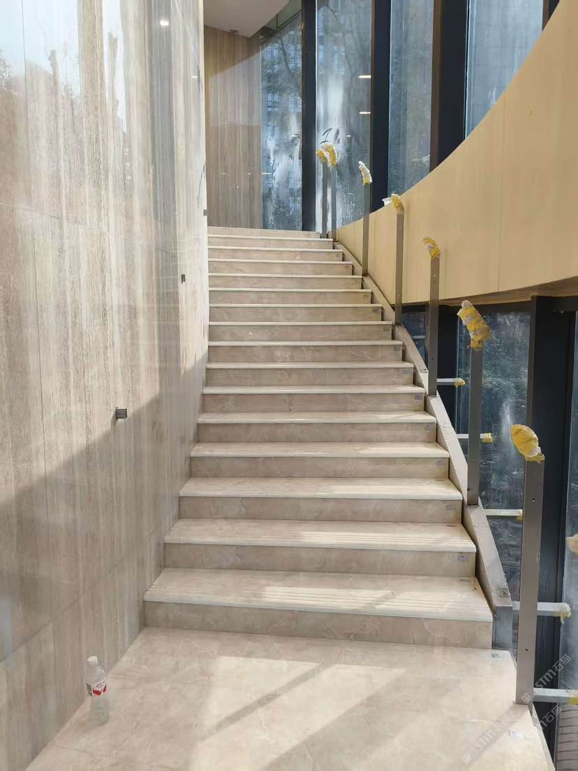 采用微晶石釉面花纹做楼梯蹋步铺贴和弧形墙面,效果杆杆的