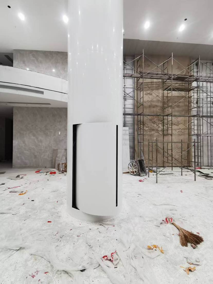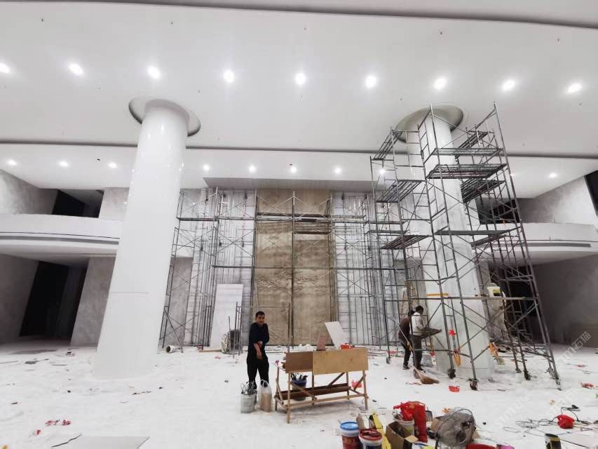 双马微晶石圆柱安装现场实景,以及流水桌面组装图