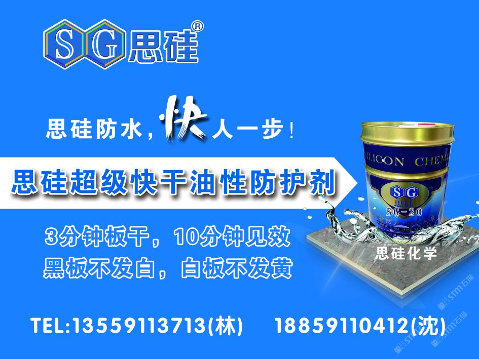发布信息: 适用于:白石、黑石、各种天然花岗岩、大理石、石灰石和人造石等板材。 采用纳米氟硅聚合物,实现3分钟干。10分钟即有防水效果。不改变石材本身色泽。透气性好,具有优异的防水效果。 建议:使用前先做小样测试,尤其是不熟悉的板材。