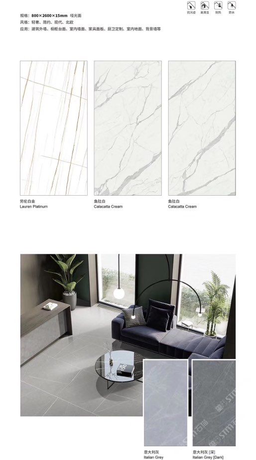 发布信息: ????SIBELAN 斯贝纳岩板???? ????意大利设计师精选岩板???? 我们可以帮老总您加工为成品, 全国范围內可安排专业团队安装. 做到您一次性采购 省心. 放心. 省时. 低价! 岩板纹路版面全多达199 款 励志做服务五星的岩板专业供应商 鱼肚白 雪花白 格兰云天 寒江雪 爵士白 幻影灰 劳伦黑金 火山灰 亚马逊 艾维拉 罗马黑檀 贝特岩 细花白 罗马灰 云朵拉灰 鱼肚金 莎罗娜 莎罗兰 劳伦白金 拉萨白 中花白 灰冰玉 卡拉拉白 撒金黑 清水玉 萨瓦灰 莎士比亚 大花灰 白冰玉 银灰洞 阿玛尼灰 绿纹玉 绿冰玉 蓝纹玉 保加利亚灰 铁锈 黑木纹 流砂灰 纯白 纯灰 纯黑 TEL: 15905069590 聂 各种版面规格全部如下: 1200×600×11mm 哑光 1500×800×11mm 哑光 1800×900×11mm 哑光 1800×900×12mm 哑光 2600×800×15mm 哑光 2400×1200×6mm 哑光/亮光 2400×1200×9mm 哑光/亮光 2400×1200×15mm 哑光 2700×1200×6mm 哑光/亮光 2700×1600×12mm 哑光/亮光 3200×1600×6mm 哑光/亮光 3200×1600×12mm 哑光/亮光