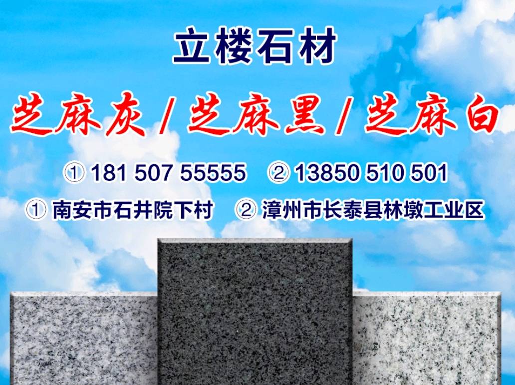 发布信息: 【立楼石材】厂家直销,价格优惠[强]? 主营【芝麻黑,芝麻灰】 ※诚信为本,保质保量※ 精品.专注:园林景观工程,墓碑、干挂板、地铺石、路沿石、规格板、蘑菇石、马蹄石。 各种异形加工、光面、火烧面、荔枝面、自然面、釜剁面、菠萝面、水洗面、拉丝面等等。 优质毛板,成品板大量库存,价格便宜,欢迎询价 电话:181 507 55555 黄 厂址一:南安市石井镇院下村 厂址二:长泰县林墩工业区