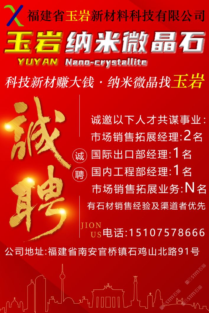 发布信息: 福建省玉岩新材料科技有限公司 科技新材赚大钱?纳米微晶找“玉岩” 产品名称:岩熔玉石 学术名称:纳米微晶石 产品特性: 一零:零辐射 二防:防滑;防污 三耐:耐磨;耐酸碱;耐高温 四可:可透光;可回收;可热弯;可加热。 企业使命:推动环保建材,共建美好未来。 企业愿景:融纳米微晶石,塑匠心玉岩魂。 企业价值观:感恩奉献,成人达己,科技创新,精益求精。 生产厂家: 福建省中郡庄艺新材料科技有限公司荣誉出品。