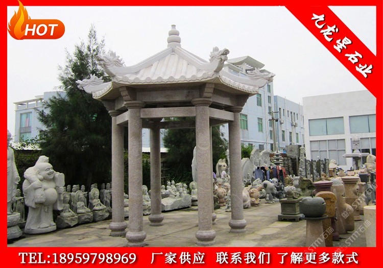 发布信息: 九龙星石业常年加工生产石雕凉亭(电话:18959798969) 石雕凉亭是指用石头加工而成的亭子,常建在花园、公园中或路旁开敞的纳凉亭榭或亭子,供行人休息、乘凉或观景用。常由柱子支撑屋顶建造。 石雕凉亭体量小,平面严谨。