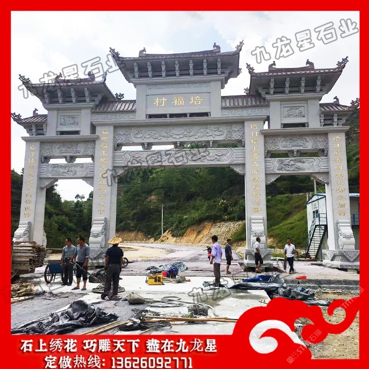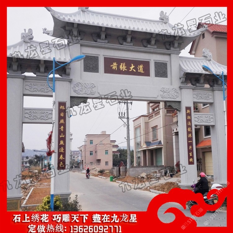 发布信息: 农村村口牌坊 石牌坊生产厂家——九龙星石业。 农村村口牌坊制作内容丰富,雕刻精美,每一座石牌坊都瑰丽华美,都是经过石牌坊雕刻厂家精雕细刻加工而成的。 从农村村口牌坊设计来看,规格主要可以分为单门牌坊、三门牌坊、五门牌坊等,在样式上可以考虑冲天式牌坊或者不出头式牌坊。此外石牌坊本身的雕刻图案选择也非常多,根据当地的风土人情以及文化特色等,在牌坊的设计上都会有很大的不同,考虑村庄石牌坊多少钱,也会考虑到牌坊本身的工艺设计以及雕刻的精细度情况,做工越是精致牌坊的价格越高,做工要是普通的话相对来说也就不需要那么多钱。