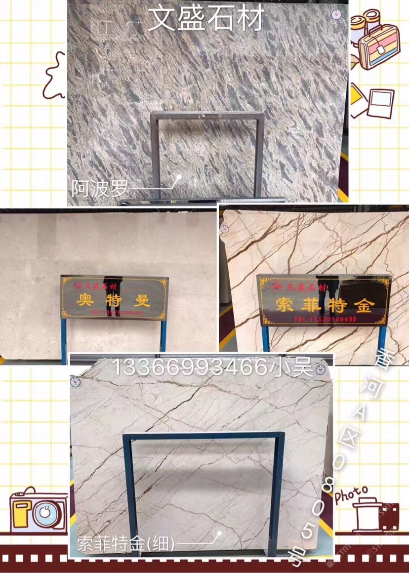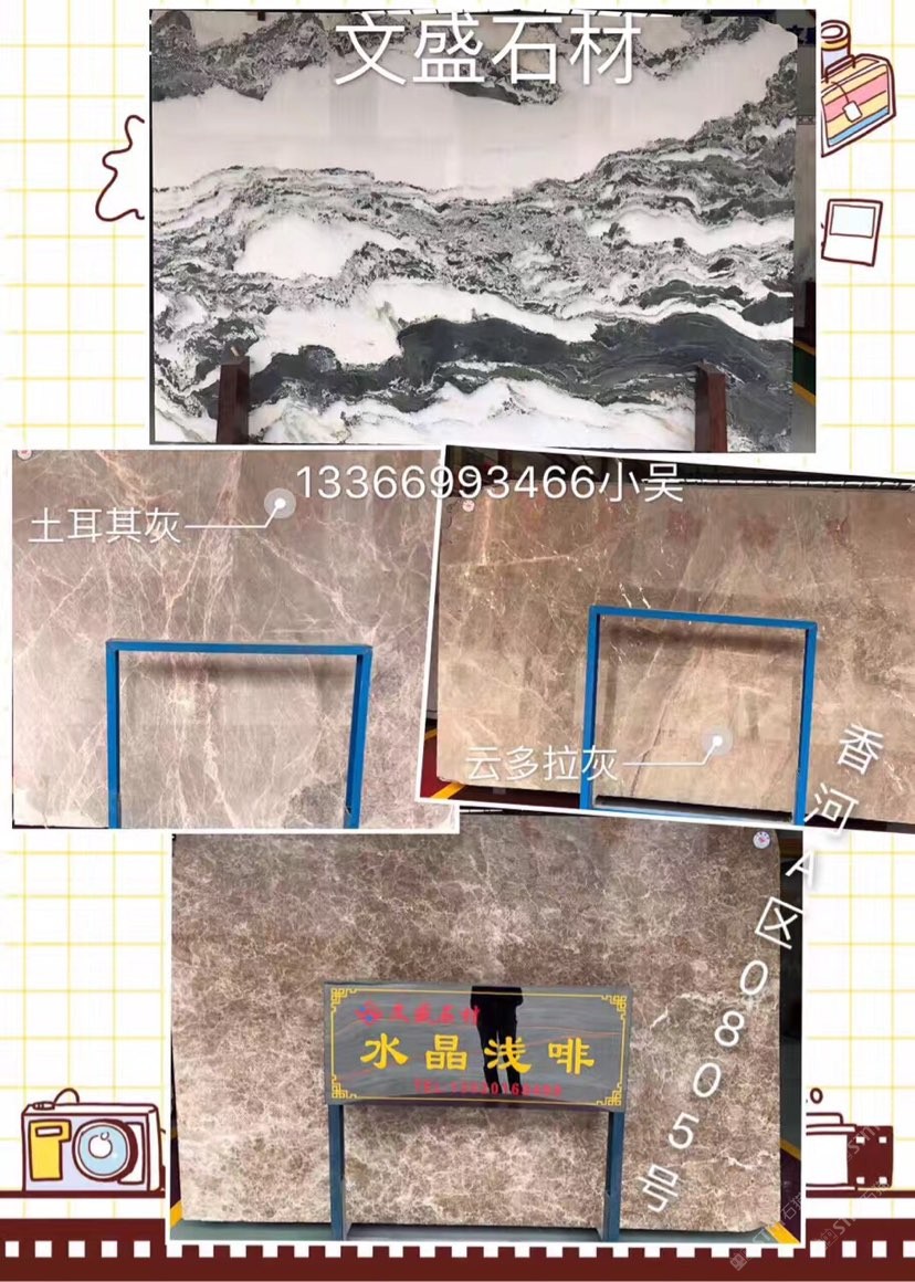 发布信息: 文盛石材主营:水晶浅啡,云多拉灰,闪电米黄,阿波罗,索菲特金,奥特曼,灰姑娘,爵士白,拿铁灰,塞浦路斯灰,土耳其灰,。 联系人:吴志煌。 电话 :13366993466。 地址:香河石材城A区0805号
