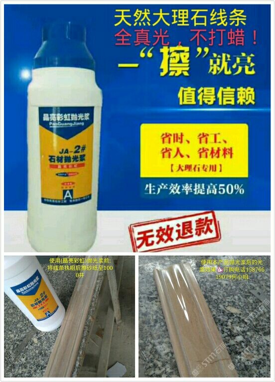 发布信息: 天然大理石线条执粗磨后只需擦纱纸从150#到240#至1就有这光度了.[强]目数越高亮度越光[强]省时省力省材料[强]使用晶亮彩虹抛光抛光浆就是光棒[得意]订购电话:15876619079何小姐
