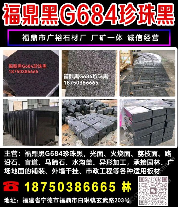 发布信息: 福鼎黑G684珍珠黑,光面、火烧面、荔枝面、路沿石、盲道、马蹄石、水沟盖、异形加工,承接园林、广场地面的铺装、外墙干挂、市政工程等各种适用板材 欢迎新老客户来电咨询 18750386665 林 地址:福建省宁德市福鼎市白琳镇玄武路203号