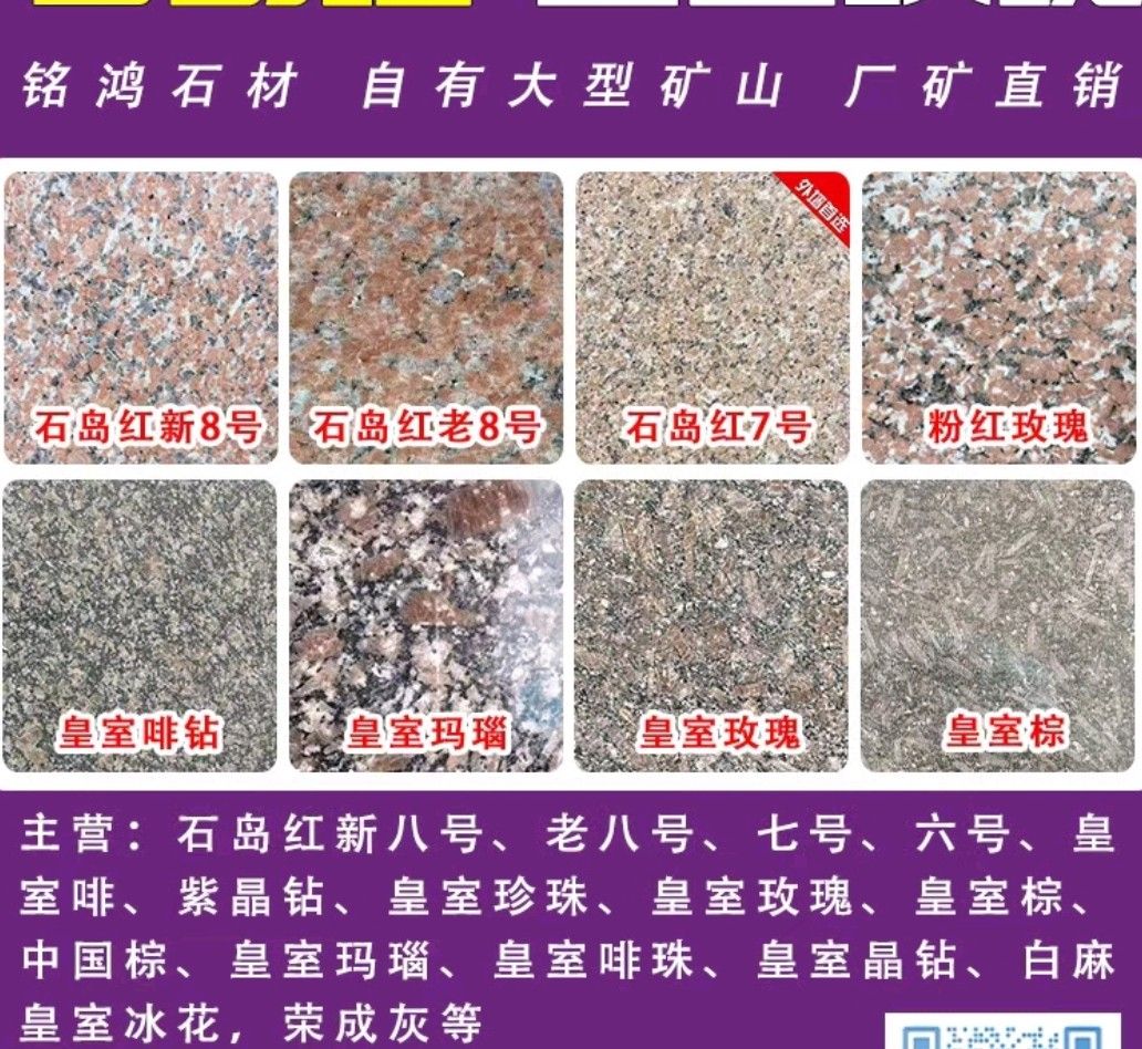 发布信息: 荣成市人和镇铭鸿石材 主营 石岛红新八号、老八号、七号、六号 皇室啡、紫晶钻、皇室珍珠、 皇室玫瑰、皇室棕、中国棕、 皇室玛瑙、皇室啡珠、皇室晶钻、白麻,皇室冰花,荣成灰,等 欢迎新老客户来考察与下 订单 电话:15063142888 地址:山东省荣成市人和镇