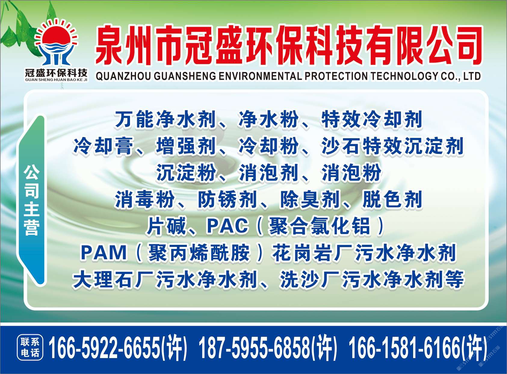 发布信息: 冠盛环??萍?6659226655 主营产品:净水剂,冷却剂,冷却粉,大理石人造石专用净水剂,沉淀粉,消泡剂,消毒净水剂,防锈净水剂,除锈剂,除臭剂,聚丙烯酰胺,聚合氯化铝,卤精,洗沙专用净水剂,压滤机专用净水剂,陶瓷厂专用净水剂(黄药 白药)等所有水处理环保材料……