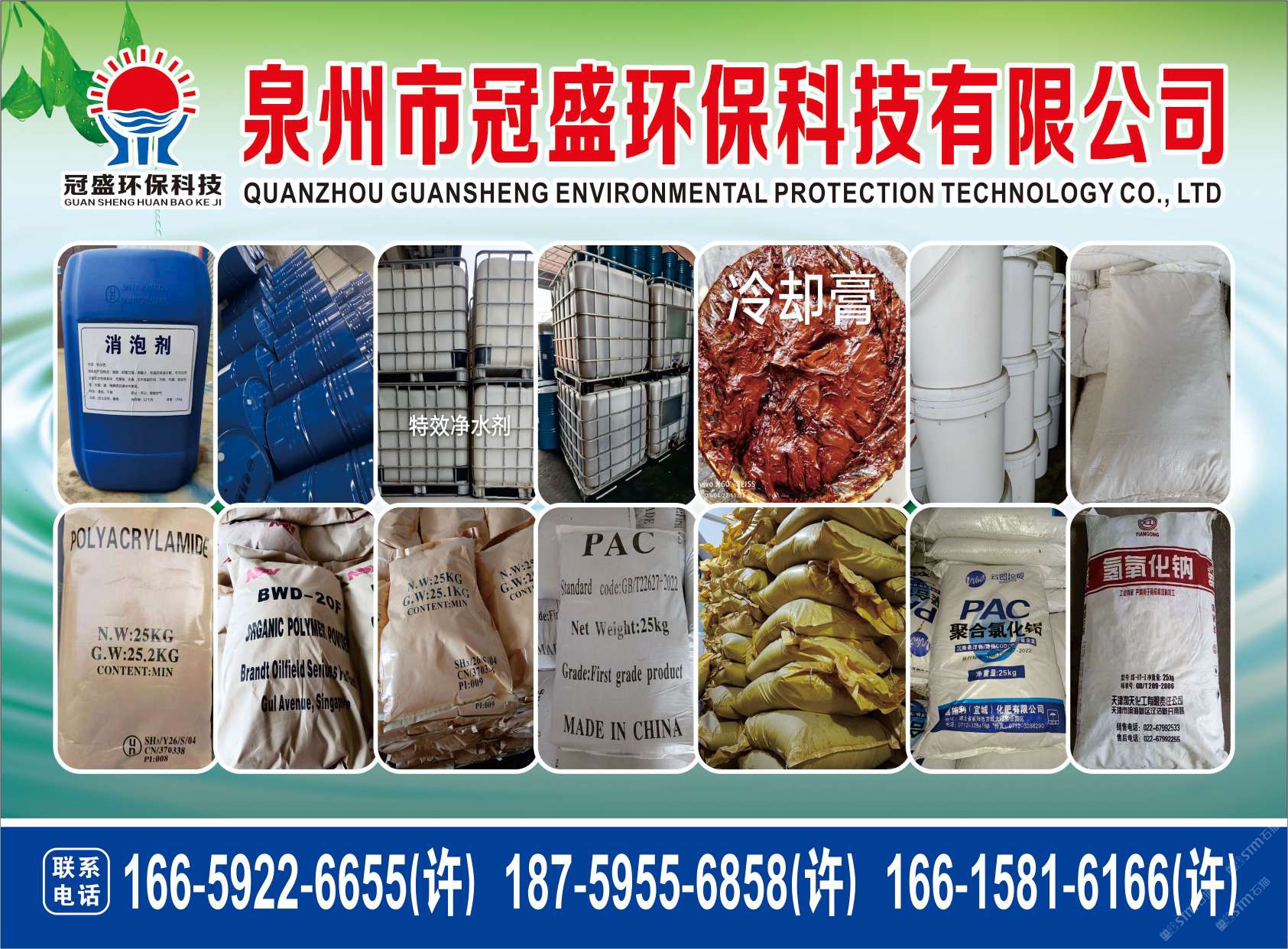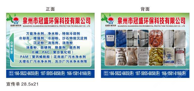 发布信息: 冠盛环保科技18759556858 主营产品:净水剂,冷却剂,冷却粉,大理石人造石专用净水剂,沉淀粉,消泡剂,消毒净水剂,防锈净水剂,除锈剂,除臭剂,聚丙烯酰胺,聚合氯化铝,卤精,洗沙专用净水剂,压滤机专用净水剂,陶瓷厂专用净水剂(黄药 白药)等所有水处理环保材料……