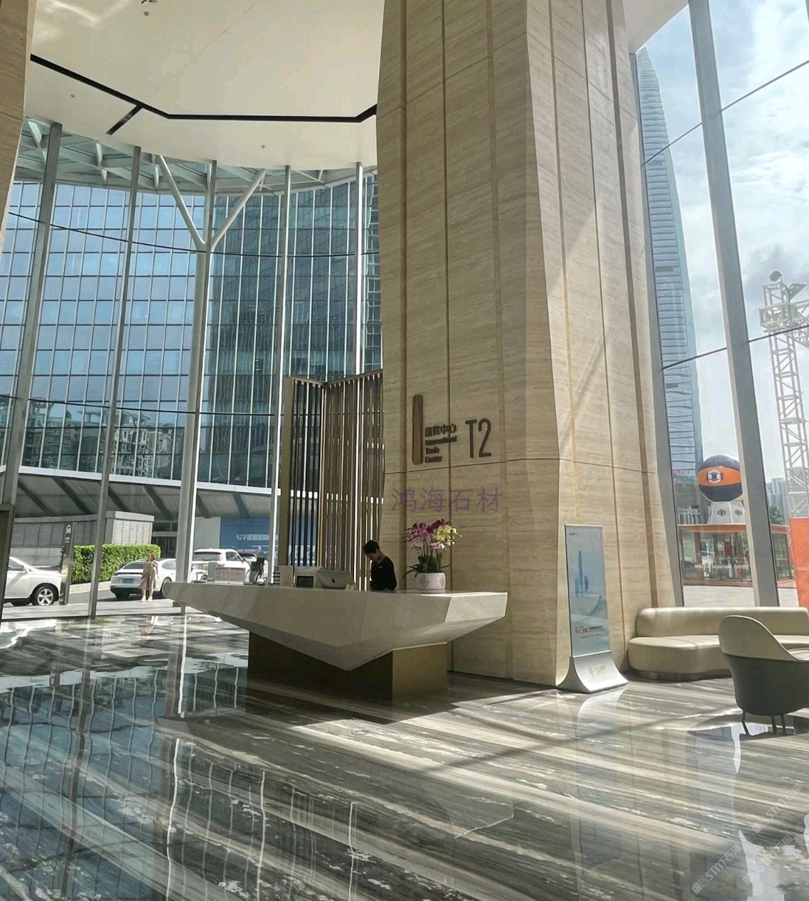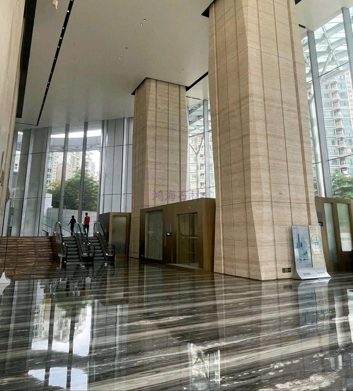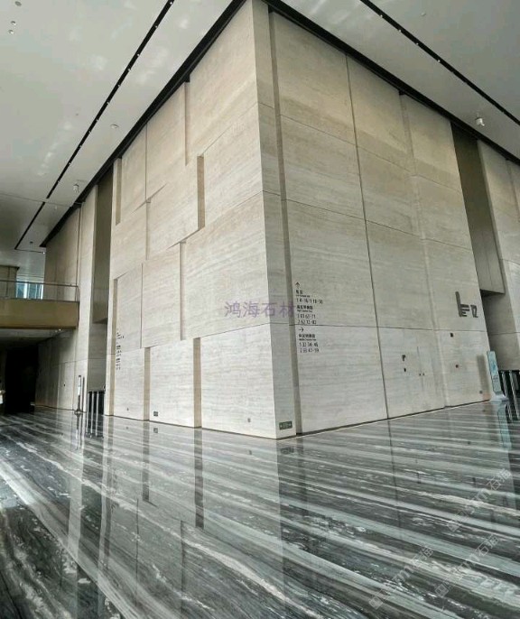 发布信息: 东莞国贸中心写字楼 #东莞写字楼#东莞国贸中心,地面石材铺贴纹理非常好看,石材纹理像河流浪花??,大堂墙面用浅色洞石材料,巨大的柱子用洞石做造型像树干,核心筒立面造型像石头,搭配地面灰蓝色水纹石材,寓意浪花击石;材料色调和谐,古铜金属面板提升造型精致度,金属质感与洞石触感的碰撞非常有意思;大空间里细节满满的设计。