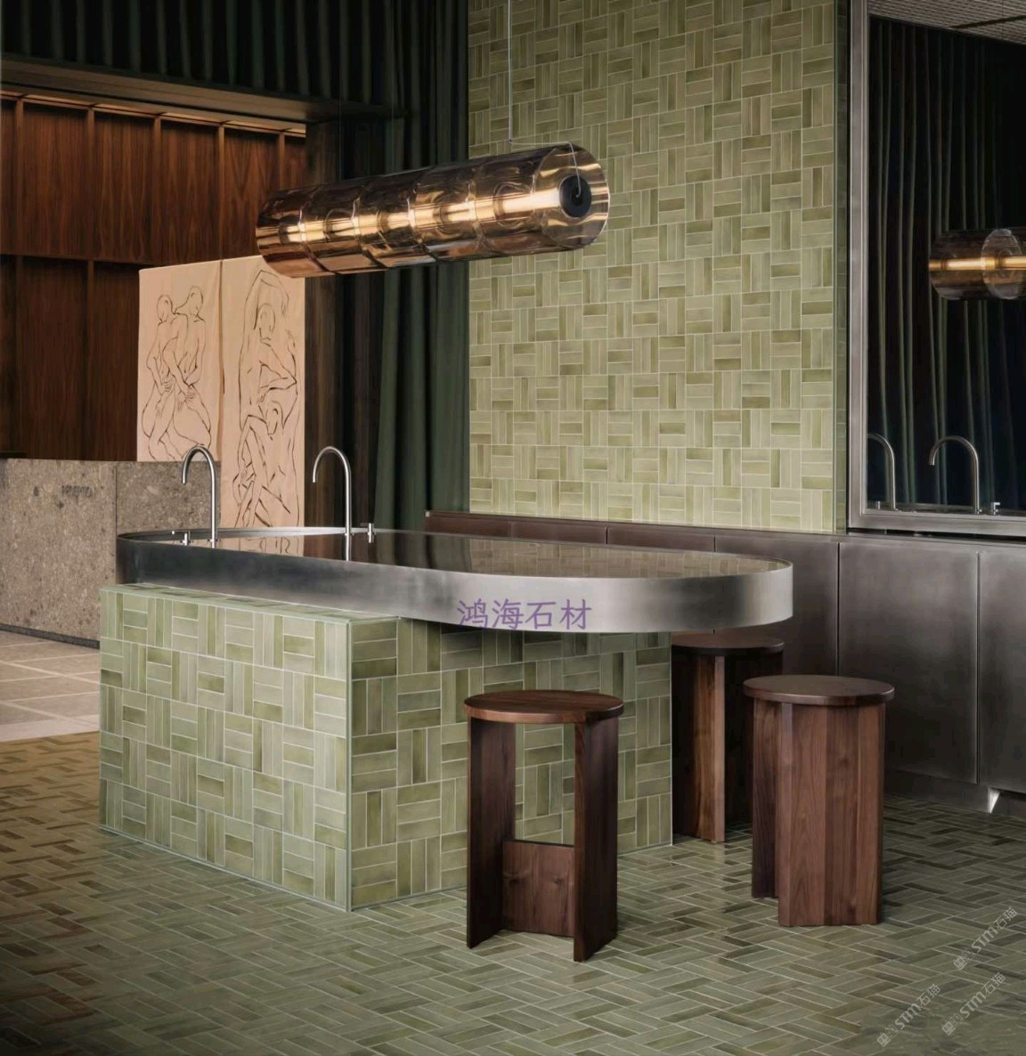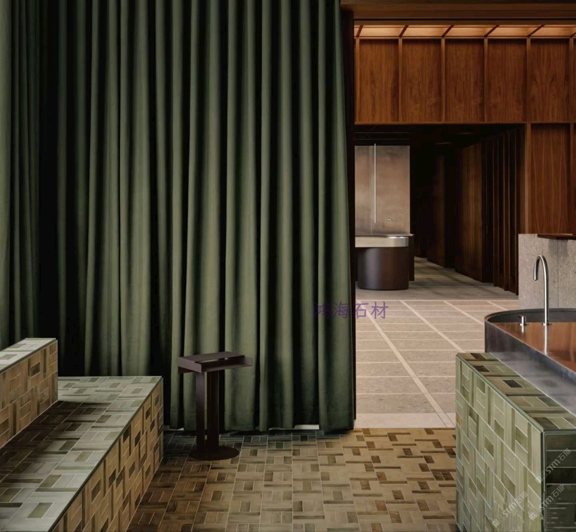 发布信息: 鸿海石材为皮肤科诊所打造差异化空间,突破传统医疗场所冰冷刻板的局限。设计融入金属格栅与无机环氧水磨石等材质形成呼应,滑动穿孔面板实现医疗与咖啡休闲区的灵活切换,深绿窗帘、红色丝绒座椅与绿色水磨石交错铺贴,营造出堪比高端水疗中心的温润疗愈氛围。