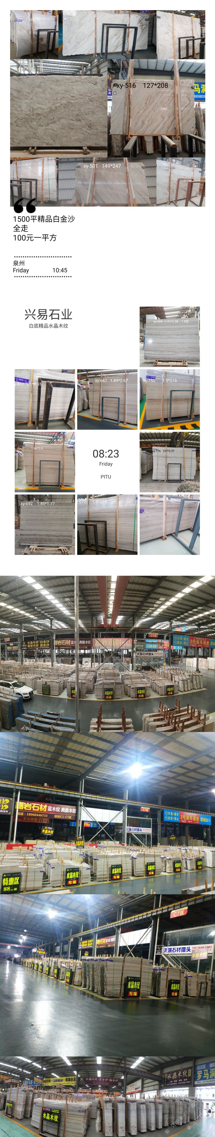 发布信息: ? ? ? 【兴易大理石】 ? ? 白底水晶木纹专场 ? 我司主营水晶木纹系列: 水晶木纹,翡翠木纹,国产蓝金沙,白金沙,彩虹木纹 ? 2万平精品白底水晶木纹新料任选, 条板,大板 荒料均有售,统一花色,防水背胶供应! 500平蓝底水晶木纹全走价优 1300平斜纹白金沙全走价优 欢迎新老客户来电垂询! ? ?地址: ? 滨海高时物流一号馆大门旁 ? 创安c区c7区兴易石材 ? 电话:13514000031小李 ? ?