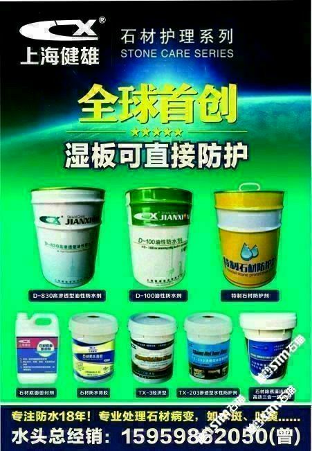 发布信息: 需要做防水的找我哦!主营:水性防水剂,油性防护剂(湿板直接防水,质量超级好?。ǜ谘页饧粒ǔ逗糜?,不会再反锈),大理石除黄剂,花岗岩增色增艳剂!水斑剂等等!咨询电话??15959862050