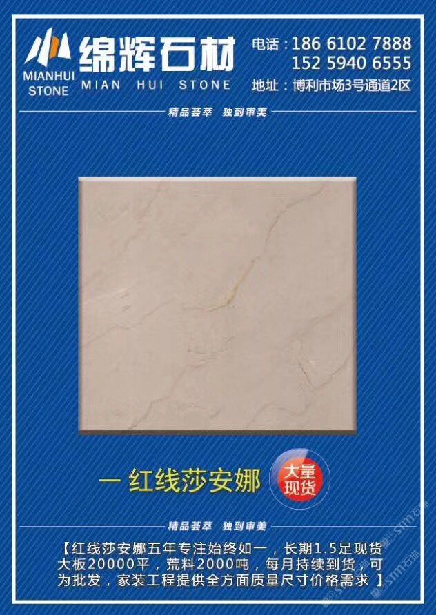 发布信息: 绵辉石材·石通天下E10区卖场 2800平《金欧典》5900平《红线莎安娜》限量特价90元起,工程单福利,清完为止,速来捡漏 咨询?? :13004819222李