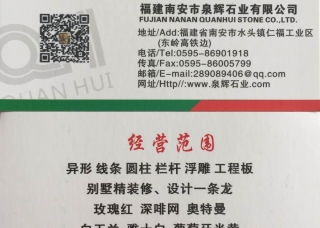 泉辉石业主营产品:玫瑰红,深啡网,奥特曼,白玉兰,雅士白,葡萄牙米黄,德国米黄,欧洲米黄,水晶莎安娜,水晶玫瑰,湖北黄金麻(荔枝面),英国棕,印度红棕,印度红(新矿),G636,芭拉白企业地址:福建南安水头镇仁福工业区(东岭高铁边)