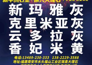 弘一·金言成石业主营产品:云多拉灰,云多拉灰17,云多拉灰3,云多拉灰(老矿)1,云多拉灰(新云朵拉灰),新云多拉灰10,云多拉灰20,云多拉灰21,云多拉灰19,新云多拉灰14,新奥特曼灰,奥特曼灰(国产),奥特曼灰(1号矿),新奥特曼灰(湖南矿),新奥特曼灰(新玛雅灰),奥特曼灰1,奥特曼灰(奥斯卡),奥特曼灰,英格兰灰(老矿),布朗灰(英格兰灰),马丁灰(国产),香雪梅,香雪白,香雪白1,香雪白2,寒江雪(多瑙河),寒江雪,宝格丽白(意大利矿),芬迪白(非洲),爱马仕灰,小米灰,云朵拉灰(贵州),欧亚白(缅甸),欧亚白企业地址:福建泉州南安市水头镇弘一大板市场三期2通道G4H3H4区