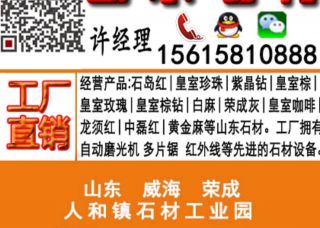 荣成市人和先业石材厂主营产品:石岛红,皇室珍珠,石岛红(7号),紫晶钻,紫晶钻1,紫晶钻2,紫晶钻小花,紫晶钻大花,皇室珍珠1,中国棕,中国棕1,皇室啡4,皇室棕,皇室玛瑙,皇室啡珠2,皇室啡珠1,皇室啡珠,皇室啡珠大花,皇室棕钻,龙须红G3787,乳山灰,皇室啡,石岛红(新8号),白麻企业地址:山东威海荣成市人和镇寨前村