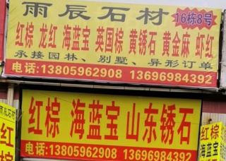 雨辰石材主营产品:山东锈石,山东锈石(火烧面),山东锈石(荔枝面),黄金麻,印度红棕,红棕,新617,G606(砻石),芝麻白(G602),海南芝麻黑(荔枝面),G648(荔枝面),虾红,海蓝宝,红珍珠,外装楼梯板(花岗岩台阶),中式石栏杆,仿古做旧,内装楼梯板(花岗岩台阶),水篦子(水沟盖),规格板,水刀拼花(花岗岩)企业地址:福建泉州闽南第一建材市场16栋8号雨辰石材